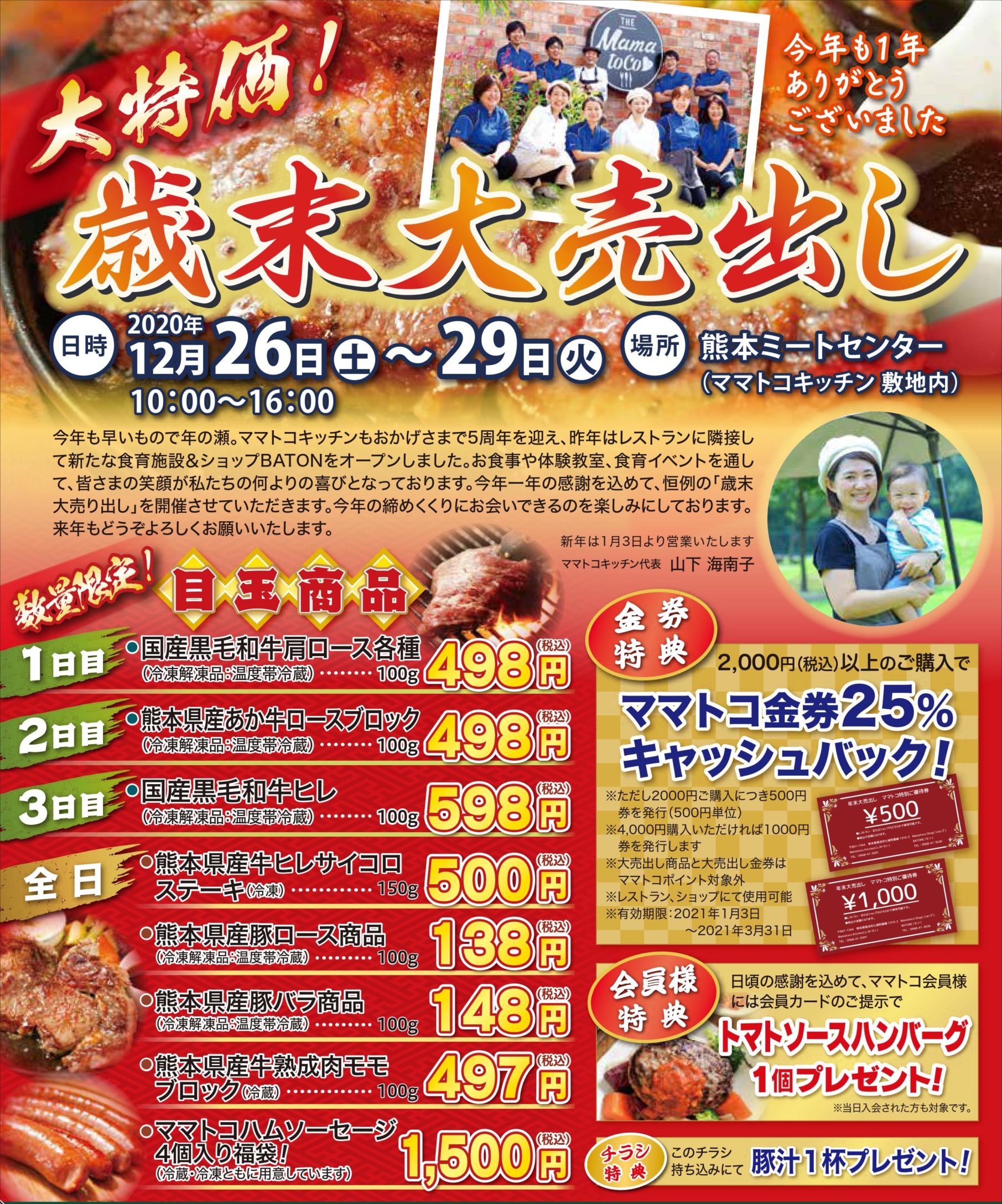12/26(土)~12/29(火)の4日間ママトコキッチン敷地内の熊本ミートセンターで開催♪